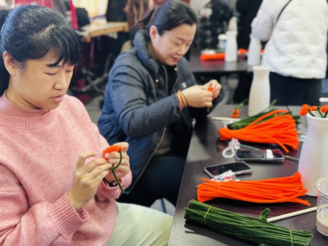 在少年宫多功能厅内,一场别开生面的“遇见美好 事事如意”扭扭棒手工制作活动正在进行。教师们相聚于此,在欢声笑语中共同庆祝节日的到来。活动中,工作室老师为大家介绍了运用扭扭棒制作柿子造型工艺花束的方法,展示了精美的“柿柿如意”作品,并鼓励大家将自己的小巧思、小新意融入缠制过程中,创作出独一无二的手工作品。大家兴趣盎然地拿起绒棒,通过弯折、缠绕、固定等一道道工序,在轻松愉悦的氛围中,灵感与创意不断浇灌,让好“柿”在指尖绽放。不一会儿,摇曳生姿的小柿子便跃然掌中,一颗颗柿子小巧精致,挂满枝头,不仅赏心悦目,更为大家带来心想“柿”成,好“柿”连连的美好愿景。大家捧着造型生动、颜色鲜艳的“柿柿如意”花束,笑在脸上,美在心间。