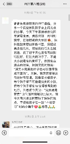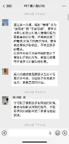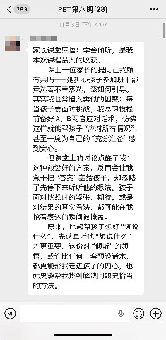 值得一提的是,七次课程不仅构建了一个学习场域,也营造了一个温暖共进的成长社群。家长们从陌生到熟识,课下更是在PET训练班微信群中持续互动:有人分享自己运用课堂方法处理孩子情绪或电子设备冲突的真实经历,有人在困惑时发出求助、获得同伴支持与老师指点。课堂是PET理论与体验的起点,而微信群的延伸交流,则成为方法落地、实践反思的延续空间,形成了“学—用—问—思”的完整闭环。